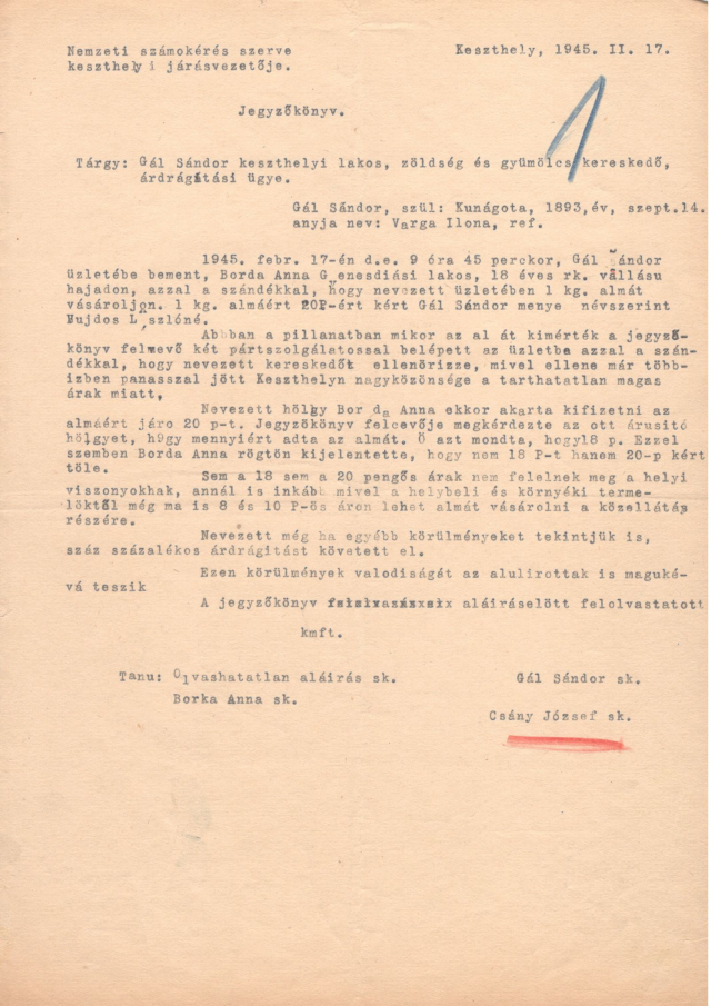 Az első ilyen ügyet elég részletesen ismerjük, mivel a napló és a népbírósági iratok mellett az NSZ-jegyzőkönyvek is rendelkezésünkre állnak. Az ügy főszereplője egy bizonyos Gaál Sándor[25] nyilas párttag és pártszolgálatos. Gaál egy rövid ideig már 1940-ben is tagja volt a Nyilaskeresztes Pártnak, majd a hatalomátvétel után újra belépett a pártba, és csatlakozott a fegyveres pártszolgálathoz. A későbbi fejlemények tükrében úgy tűnik, hogy meglehetősen jó kapcsolatban állt a helyi pártvezetőkkel. Feltehetően ennek köszönhette, hogy átadták neki a deportált Kertész Ernő férfiruhaüzletét, amelyben gyümölcskereskedést rendezett be.[26] Ráadásként még egy négyszobás lakást is kiutaltatott magának a Szálasi Ferenc utca 25. szám alatti házban (a népbírósági iratokban Bartha-féle lakásként emlegették).[27] Amikor Gaált népbíróság elé állították, az egyik tanú azzal vádolta, hogy több, egykor izraelita tulajdonban volt üzlet kiárusításában is részt vett, és a várakozók közül gyakran elzavarta azokat az asszonyokat, akiknek férje nem volt párttag.[28] Fentebb már esett szó arról, hogy Csány felesége is így járt, vagyis nem zárható ki, hogy Csányt a sértettség is vezette, amikor fellépett Gaál Sándor ellen. Az eljárás indoka árdrágítás volt, eszerint a piacon – sokszor fenyegetéssel – olcsón beszerzett gyümölcsöket a saját üzletében három-négyszeres áron adta tovább. Erre hivatkozva Csány február 17-én bezáratta Gaál boltját, a lakásából pedig kilakoltatta, majd némi huzavona után Csány épp ebben a lakásban rendezte be saját irodáját.[29]