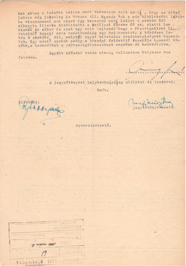 Én kijelentettem, hogy az én lakásomon van zsidó bútor, melyet a nálam előzőleg lakó menekültek hagytak ott, és jelenleg az apám, aki szintén menekült, ő használja. Az ő nevén van. Az erről felvett jegyzőkönyvet bemutattam. Elfogadták és kértem, hogy a derék testvérúr a következő gyűlésen adatokkal igazolja állítását. Ezután Szalai községvezető a járásvezető nőt[64] förtelmes durván megsértette. Ezért én őt rendre utasítottam. Ő megígérte, hogy repülni fogok én is, mert már gyűlnek az adatok.